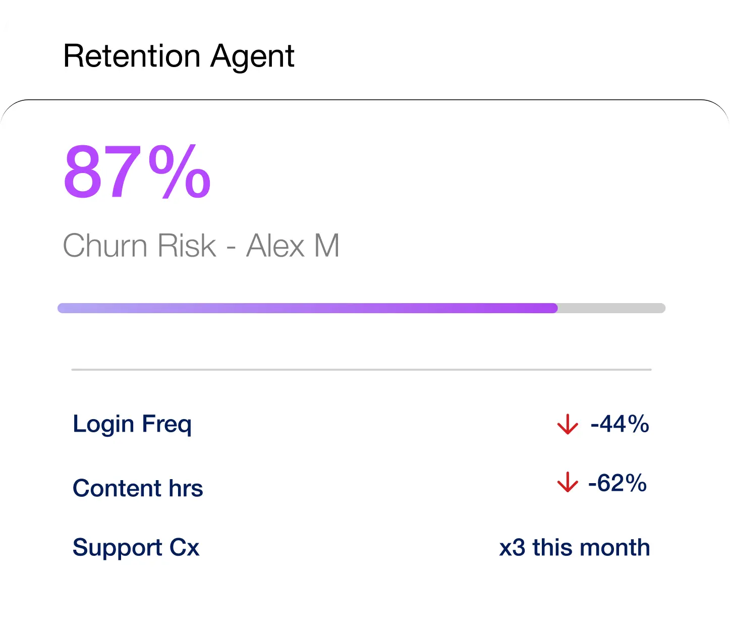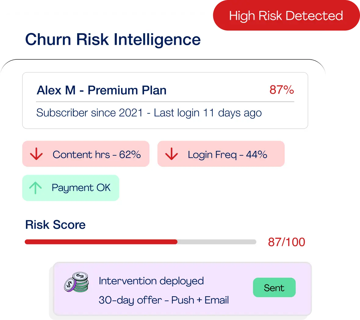 Detects churn risk from behavioural and billing signals and identifies  the highest-probability retention action.