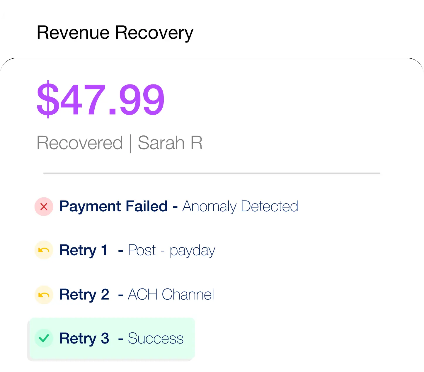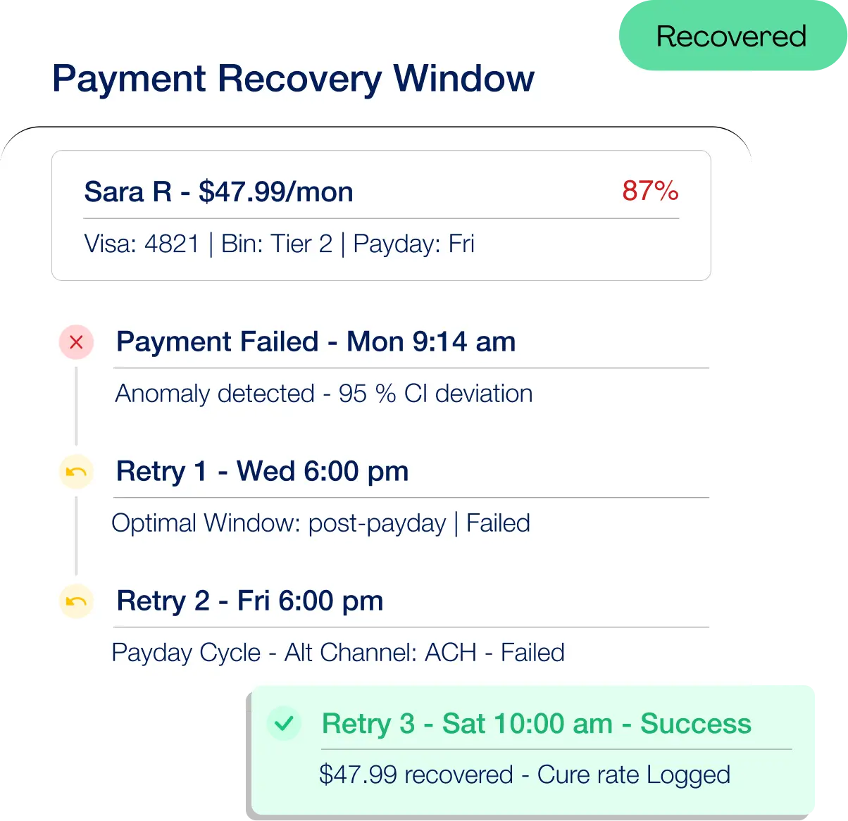 Identifies payment anomalies and executes intelligent retry strategies based on card behaviour, timing patterns, and subscriber history.