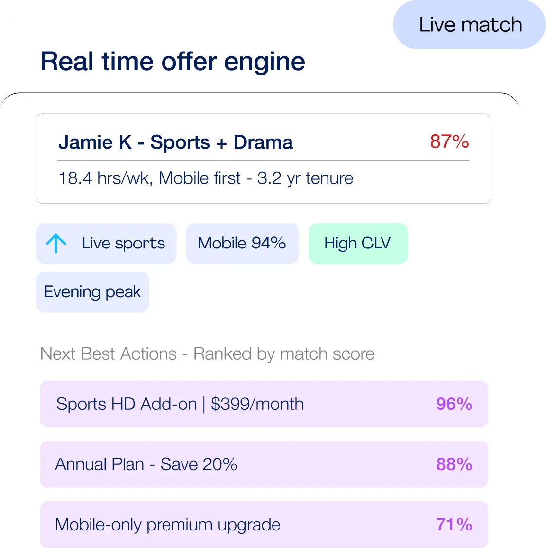 Delivers personalised onboarding journeys, upsell offers, and content recommendations in real time.