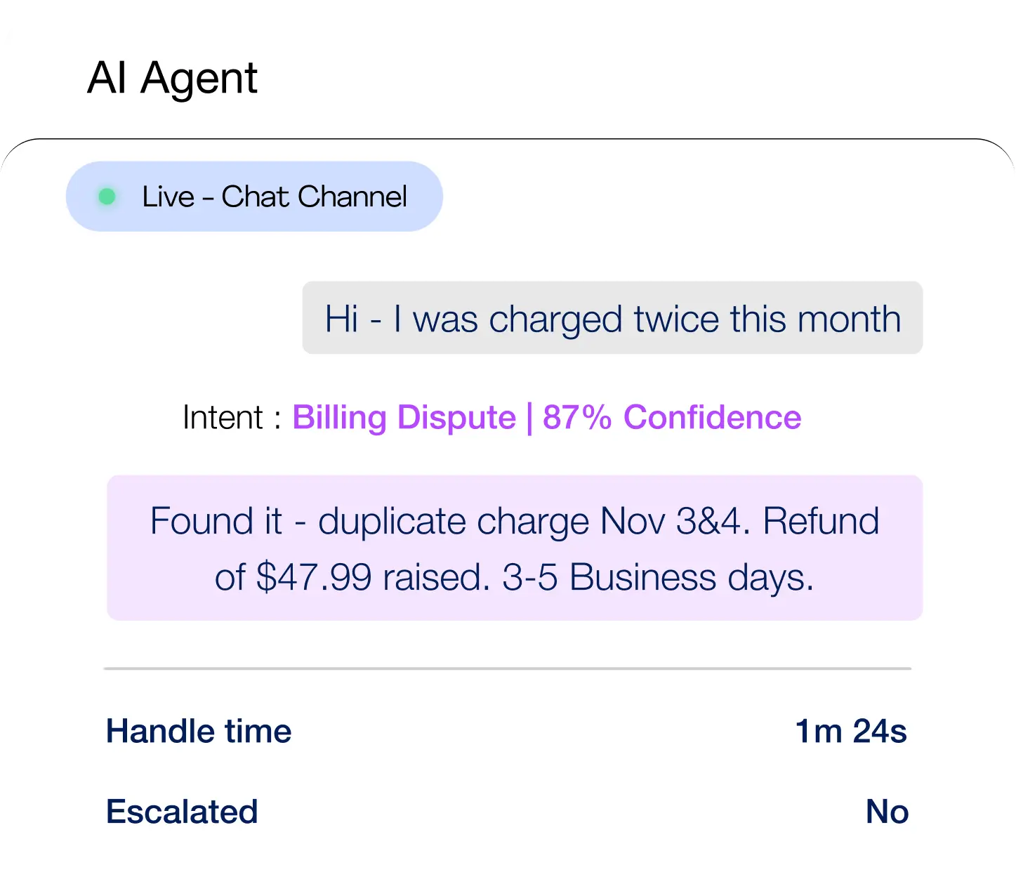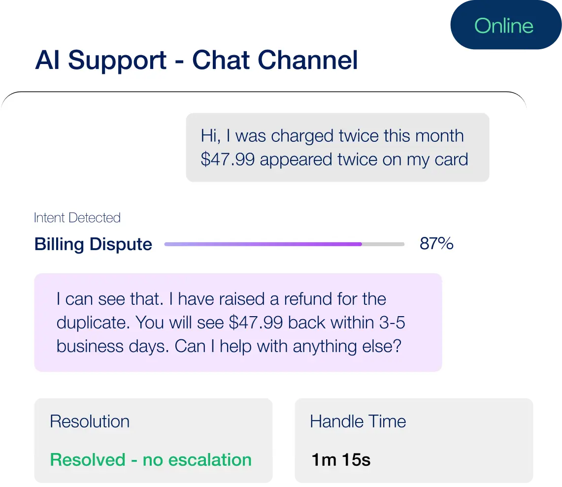 Detects subscriber intent across chat, voice, and email while giving support teams full subscriber context.