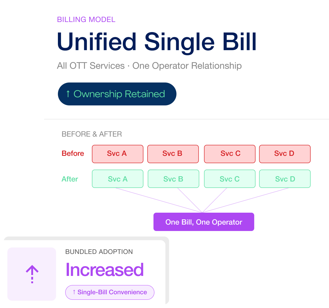 Unified multiple streaming subscriptions into a single bill. Retained customer ownership and increased bundled adoption.