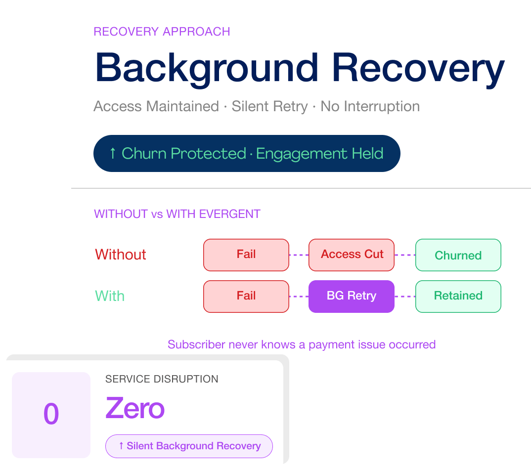 Recovered payments in the background without interrupting access. Reduced involuntary churn and protected engagement.