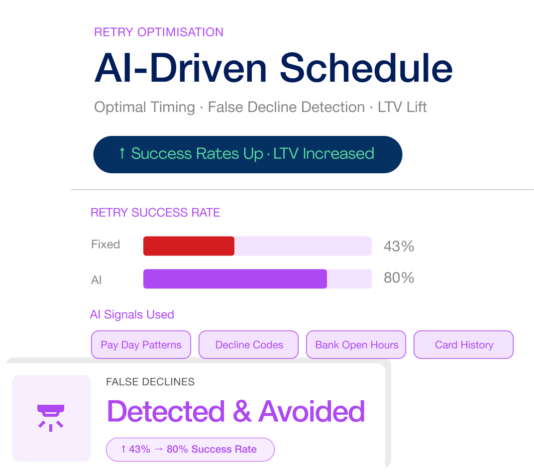 Nearly half of subscriber churn comes from failed payments, most of which are recoverable. This system uses machine learning to retry transactions at the right moment, increasing success rates while keeping the experience invisible to the user.